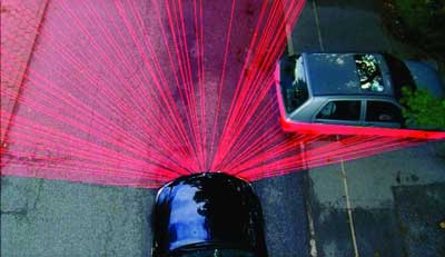 Vor uns steht ein fast serienmäßiger VW Passat. Von außen unterscheidet sich der Variant nicht erkennbar von seinen Serienbrüdern. Drei Lasersensoren, ein GPS-Navigationssystem und zwei kleine Computer sind das Herzstück des Wagens. In der vorderen Stoßstange, unterhalb der Blinker, sind nicht sichtbar links und rechts jeweils Lasersensoren untergebracht. Sie scannen den Bereich vor dem Auto auf eine Entfernung von 30 cm bis 200 Metern ab. Am Fahrzeugende sorgt ein Laser für die Hecküberwachung. Fahren ohne Fahrer Es befindet sich kein Mensch im Auto. Das Fahrzeug wird per Fernbedienung von einem Mitarbeiter gestartet. Das Fahrlicht geht an und langsam, fast gespenstisch, setzt sich der Passat in Bewegung. Er hält an einer Kreuzung, lässt entgegenkommenden Verkehr vorbeifahren und setzt sich sodann – links abbiegend – in Bewegung. Auch die Blinkzeichen vergisst das führerlose Fahrzeug nicht. Dann folgt eine Sperrung der Straße: Kein Problem für die Lasersensoren, die solche Situationen sofort erkennen. In drei Zügen wendet das Auto sicher und setzt seine Fahrt über einen anderen Weg fort. Ein Navigationssystem hilft bei der Routenführung.