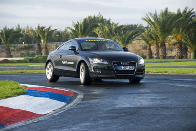 Auf einem Rennkurs im sonnigen Süden Europas geht es zuerst mit der Fremdreifenmarke auf die Strecke. Der 250 PS starke Audi TT fängt in der ersten Kurve bei genau 105 km/h an, leicht über die Vorderräder zu rutschen (untersteuern). Am Ende der Runde in einer Links-Rechts-Kombination muss ich bei ausgeschaltetem ESP schon kräftig am Lenkrad arbeiten, um nicht über die Curps zu räubern. Deutlich nimmt der Grip* dann in der dritten Fahrrunde ab und die erste Kurve kann nur noch mit knapp 100 km/h ohne Stabilitätsverlust gefahren werden.