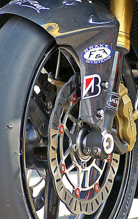 Härteprüfung: Auf einer Suzuki-Rennmaschine mussten die Titan-Ceramic-Bremsscheiben von F&F härteste Einsätze überstehen, bevor der Serieneinsatz folgen konnte.