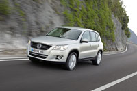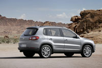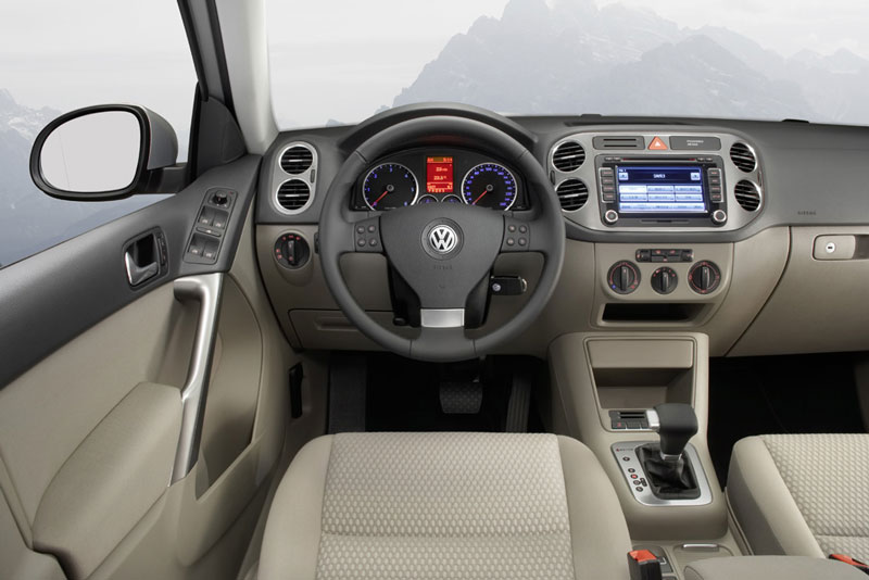 Beim 1,4-Liter TSI-Benziner haben wir dank Turboaufladung 150 PS Leistung und ein Drehmoment von 240 Newtonmetern unter der Haube. Für den täglichen Betrieb auf Kurzstrecken ist der kleine Vierzylinder ausreichend motorisiert, aber nicht sehr sparsam. Wir verbrauchten mindestens 9,6 Liter auf 100 Kilometer und 12,4 Liter bei forscher Gangart. Der Schnitt pendelte sich bei 10,8 Litern ein, was von der Werksangabe mit 8,4 Litern Superbenzin doch recht weit entfernt ist. Wer lange Strecken fährt sollte hier aufden 2,0-Liter Diesel mit 140 oder 170 PS schwenken (ab 28.800 Euro), deren Verbrauch zwischen sieben und acht Litern liegt. Reisetauglich Am Fahrverhalten gibt es nichts zu meckern. Der Tiguan ist komfortabel, fährt sich leichtfüßig und besitzt eine direkte Lenkung mit geringem Kraftaufwand. Das Sechsgang-Getriebe ist leichtgängig und auf kurzen Wegen zu schalten. Ein niedriges Fahrgeräusch und die langstreckentauglichen Sitze machen den Tiguan zu einem prima Urlaubsgefährt. Immerhin passen zwischen 505 und 1510 Liter Gepäck in den geräumigen Innenraum des Fünfsitzers. Im Fond sitzt man vergleichsweise hoch, was eine entspannte Beinhaltung garantiert. Die Rückbank ist um 16 Zentimeter längs verschieb- und geteilt umklappbar. Gute Ausstattung Die Basis-Ausstattung „Trend & Fun“ reicht für die meisten Zwecke vollkommen aus. Neben Klimaanlage sind Bordcomputer, ESP und sechs Airbags serienmäßig an Bord. Was fehlt sind Multifunktionslenkrad für 305 Euro, Xenon-Scheinwerfer für 1270 Euro, 230 Volt-Steckdose (110 Euro) und eine Anhängekupplung, die lässig auf Knopfdruck wegschwenkt (750 Euro). Beim Design haben sich die Wolfsburger mit zwei verschiedenen Fronten etwas Neues einfallen lassen: Je nach Ausstattungslinie ist der Tiguan mit großem Lufteinlass oder mit Offroad-Gesicht erhältlich. Ist man denn tatsächlich einmal im Gelände unterwegs, kann mit dem Offroad-Fahrprogramm (130 Euro) per Knopfdruck der Bergabfahrassistent (hält automatisch die Geschwindigkeit) und die Berganfahrhilfe (Wagen rollt auch ohne Fuß auf der Bremse nicht zurück) aktiviert werden. Wer sich für das Top-Navigationsgerät ab 3150 Euro entscheidet, bekommt den Parklenkassistenten dazu. Er sucht sich seine Parklücke und fährt rückwärts – ohne Fahrereingriff in die Lenkung – in Parklücken hinein. Wie haben es ausprobiert und waren erstaunt, wie gut das geht. Fazit: Der Tiguan kam spät, aber kräftig und hat gute Karten in diesem Segment. Motor: Vierzylinder, Turbo und Kompressor Hubraum: 1390 ccm Leistung: 110 kW/150 PS max. Drehmoment: 240 Nm Beschleunigung: 0-100 km/h in 9,6 s Spitze: 192 km/h Verbrauch: 8,4 l Superbenzin auf 100 km, CO2-Ausstoß 199 g/km, Testverbrauch 10,8 l Antrieb: 6-Gang-Schaltgetriebe, Allrad Länge: 4,43-4,46 m Breite: 1,81 m Höhe: 1,68 m Leergewicht: 1546 kg Zuladung: 650 kg Tankinhalt: 64 l Gepäckraum: 505-1510 l Preis: ab 26.700 Euro Bekanntes Innenleben: Das Cockpit orientiert sich stark am Golf Plus. Eine Automatik ist nicht bei allen Motoren erhältlich.